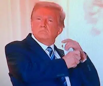 President Donald Trump removes his mask although he is still infected with the coronavirus COVID-19, White House, Oct. 5, 2020 , Washington, DC (Screengrab courtesy CNN News)