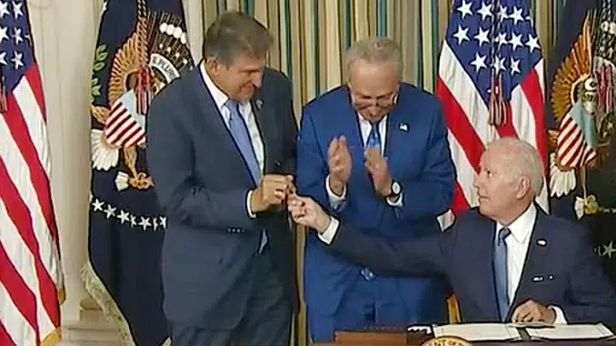 Featured image: At the signing of the Inflation Reduction Act, from left, Senator Joe Manchin of West Virginia, Senate Majority Leader Chuck Schumer of New York, President Joe Biden, House Majority Whip Jim Clyburn of South Carolina, all Democrats. August 16, 2022, State Dining Room, The White House, Washington, DC. (Screengrab from C-Span video)