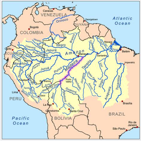 The Madeira River system originates in the Andes Mountains of Peru and travels through Ecuador, Colombia, Venezuela, Bolivia, and Brazil before emptying into the Atlantic Ocean.