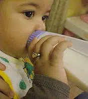 Baby drinks from a plastic bottle. (Photo credit unknown) |