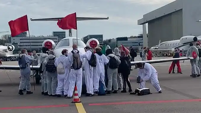 At Amsterdam’s Schiphol Airport today, climate activists blocked private jets from taking off. Hundreds of activists walked or cycled to the platform for private jets at Schiphol. Greenpeace Netherlands said, “We sat under the parked jets and cycled along the taxi route, to prevent polluting private jets from leaving for as long as possible.”