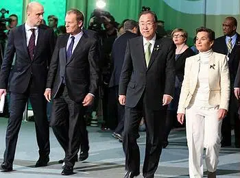 Korolec, Donald Tusk, Prime Minister of Poland, UN Secretary-General Ban Ki-moon and UNFCCC Executive Secretary Christiana Figueres, Nov. 19, 2013 (Photo courtesy Earth Negotiations Bulletin)