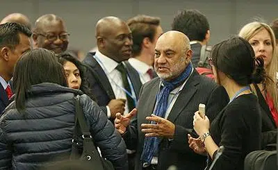 Delegates discuss issues informally with Gurdial Singh, Malaysia, in blue scarf, who spoke on behalf of the Like-Minded Developing Countries (Photo courtesy Earth Negotiations Bulletin)