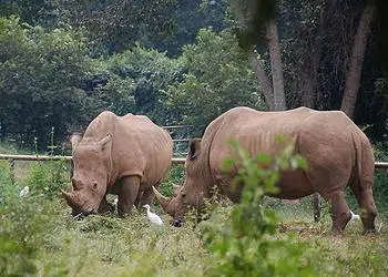 Rhinos in the Uganda Wildlife Education Centre in Entebbe, Uganda. (Photo by Dylan Walters)