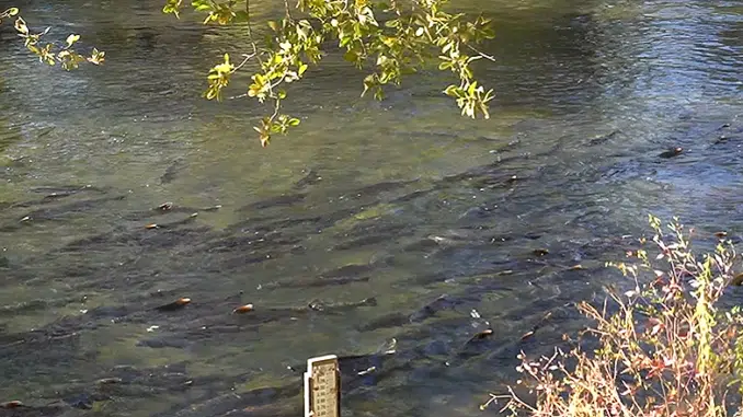 Featured image: Fall-run Chinook salmon swimming in Battle Creek at the entrance of Coleman National Fish Hatchery, Sacramento, California. October 15, 2021 (Screengrab from video courtesy Dennis Whitaker/Golden State Salmon Association)