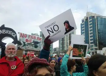 Vancouver demonstrators also expressed their opposition to U.S. oil giant Kinder Morgan’s $5 billion plans to triple the capacity of its Trans Mountain pipeline, which carries crude oil from the Alberta tar sands to tankers in Vancouver. Objections center on increased tanker traffic into narrow Burrard Inlet, which already is crowded with cargo vessels.