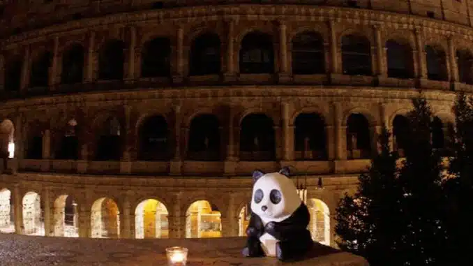 Featured image: Earth Hour 2021 celebrations in Rome, Italy where the 1,944-year-old Coliseum went dark for an hour, as it has since 2008. WWF’s panda mascot is shown enjoying a celebratory beverage. March 27, 2021 (Photo © Emanuele Coppola / WWF-Italy)