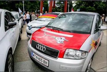 Europe’s largest electric vehicle rally passes through Geneva, Switzerland on the Place des Nations after travelling 1,300km from Bremerhaven, Germany, June 17, 2016. (Photo by Pierre Michel Virot / UN)