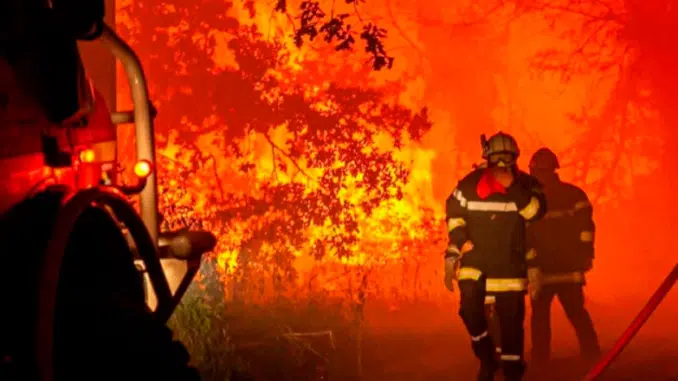 Featured image: Firefighters battle a wildfire near Landiras, southwestern France, July 17, 2022 (Photo courtesy fire brigade of the Gironde region)