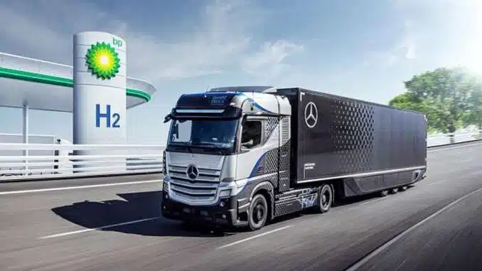 Featured image: Daimler heavy-duty hydrogen fuel cell truck passes a hydrogen station on a road in the European Union. 2023 (Photo courtesy Daimler)