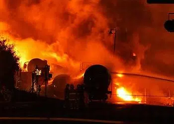 In the United States, the most recent explosive derailment occurred in April of last year, in downtown Lynchburg, Virginia, resulting in crude oil leaking out of punctured tank cars, setting the James River on fire.