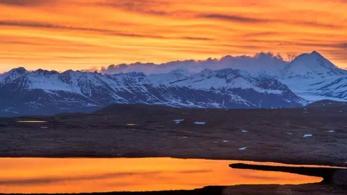 Featured image: Sunset over the Delta Wild and Scenic River Watershed in Southcentral Alaska. 2014. The Watershed includes 150,000 acres / 607 square kilometers of land, 160 miles / 257 kilometers of streams and 21 lakes, offering habitat for migrating caribou, 100+ species of migrating birds, and a variety of fish. Surrounded by arctic tundra, this is a popular place for people picking berries. (Photo by Bob Wick, U.S. Bureau of Land Management)