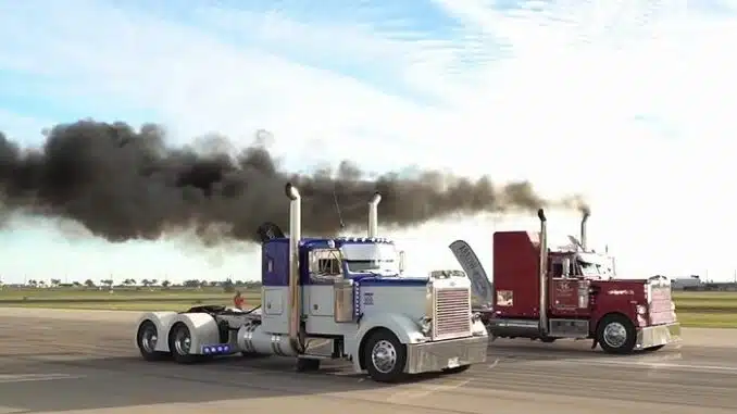 Featured image: Diesel trucks spew exhaust emissions into the air at a race track in California. California state regulators have approved a ban on the sale of new big rigs and buses that run on diesel by 2036, going beyond the federal government. (Photo courtesy California Air Resources Board)