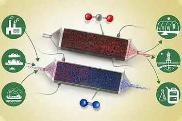 In operation, the device would simply alternate between charging and discharging, with fresh air or feed gas being blown through the system during the charging cycle, and then the pure, concentrated carbon dioxide being blown out during the discharging.