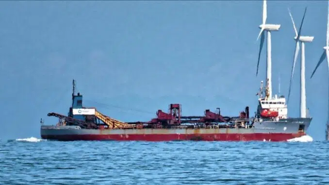 Featured image: Dredger for the City of Westminster passes the Thanet Wind Farm off Broadstairs, Kent, UK, August 13, 2017 (Photo by Acabashi)