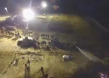 Tonight’s clash is happening just north of the long-standing encampment of hundreds of Native Americans and others protesting the routing of the Dakota Access oil pipeline under a source of drinking water and the destruction of their sacred sites.
