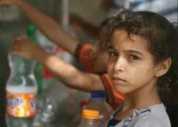 Children in Rafah, a Palestinian city and refugee camp in the southern Gaza Strip, collect water from a public tap. Water systems, wells and sewage plants were damaged in the 2014 airstrikes, limiting the water and sanitation to 900,000 people – half of Gaza’s population. July 13, 2014 (Photo by Oxfam International)