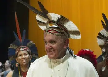 At an event in Rio de Janeiro’s Municipal Theater for several thousand of Brazil’s political, business and cultural elite on Saturday, Pope Francis met several indigenous Amazon men with pierced noses, body paint, feather headdresses and straw skirts who told the pontiff they are fighting to preserve their traditional lands from development.