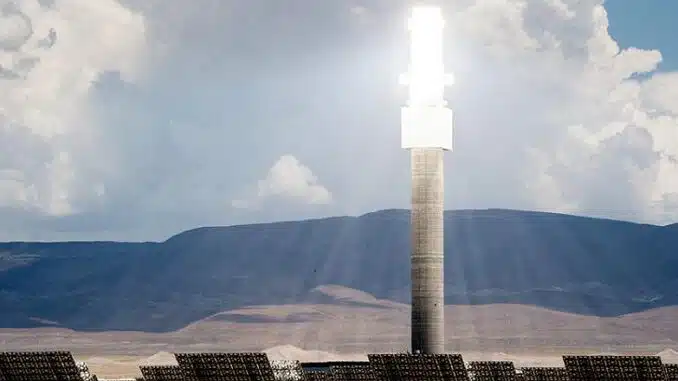 Featured image: Over 10,000 tracking heliostats focus solar energy at the receiver on the 640 foot power tower at the Crescent Dunes Solar Thermal Facility, owned by SolarReserve. The facility provides more than 500,000 megawatt hours of electricity a year, available day or night through molten salt storage. July 23, 2017, Tonapah, Nevada (Photo by Dennis Schroeder courtesy National Renewable Energy Lab)