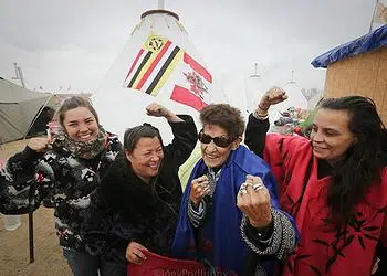 Indigenous women at the Oceti Sakowin protest camp, from left: Taylor Peterson, Katherine Morrisseau, Nancy Scanie, and Fawn Youngbear-Tibbetts. Clan Grandmother Nancy Scanie from Cold Lake Dene First Nation in Alberta, Canada represents the Athabasca Keepers of the Water. Dec. 2, 2016 (Photo by Joey Podlubny)