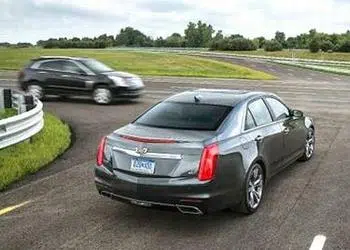 PHOTO: A 2015 Cadillac CTS, equipped with V2V technology, notifies the driver of the approaching Cadillac SRX from the left before the driver could see the vehicle. (Photo courtesy General Motors)